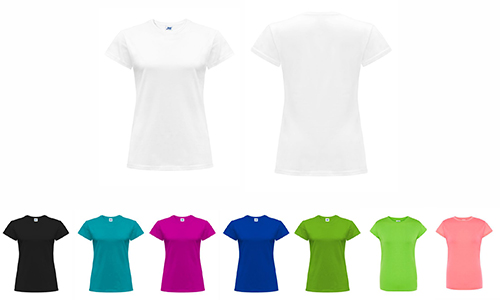 Basic t-shirt for women with short sleeves, 100% cotton. Ideal for personalizing with silkscreen, vinyl, transfer and digital printing. Also available for men, children and large sizes (Curves line), from size S to XXL..